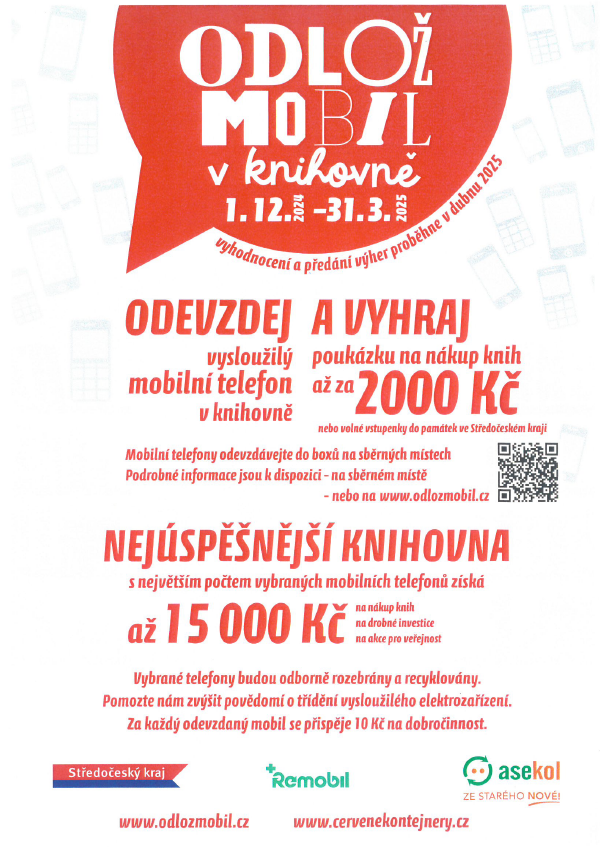 V naší knihovně probíhá již druhým rokem akce s názvem „Odlož mobil v knihovně“, která má za cíl ekologickou likvidaci vysloužilých mobilních aparátů a zároveň připomenutí útulného zázemí v jenštejnské knihovně plného báječných titulů pro zimní odpočinek s vůní knihy v ruce.